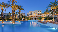 Built of yellow limestone and framed by palm trees that surround a series of oasis-like pools, the classically designed luxury property exudes elegance from the moment you enter the grounds. The 137 rooms and suites are tastefully appointed in soothing neutral tones, each with brown marble bathrooms and balconies.